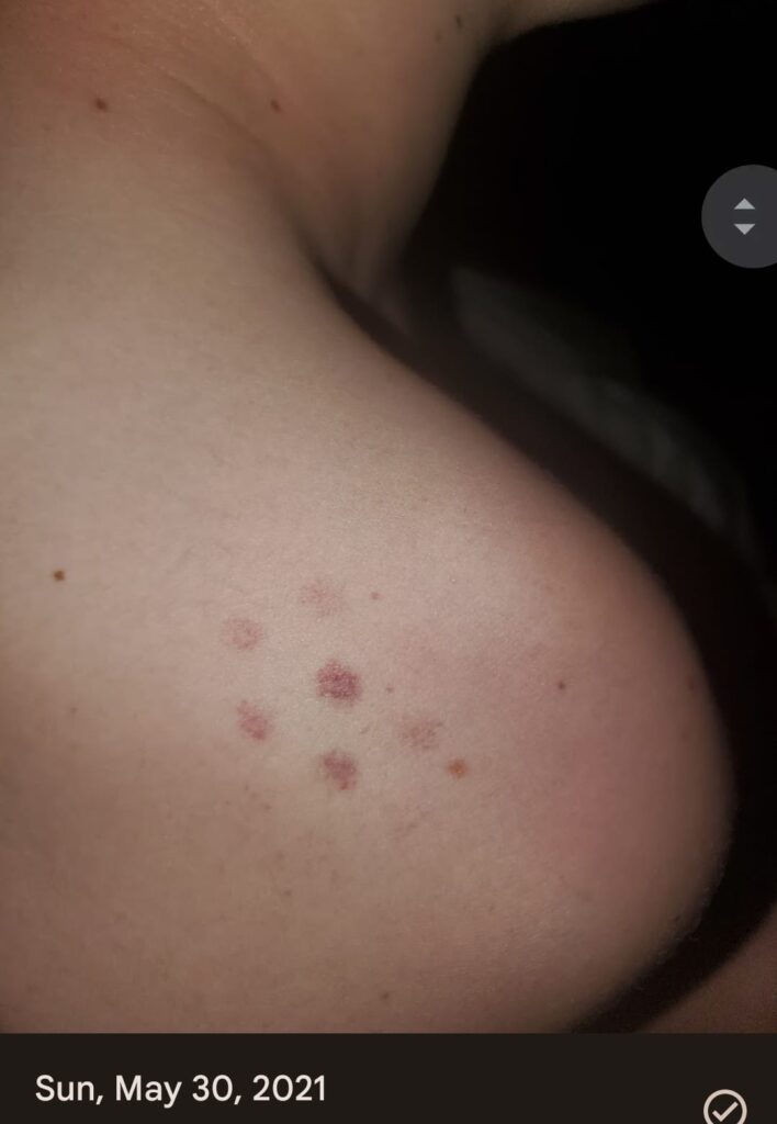 On May 30, 2021, a mother snapped a photo of her 13 year old son while he was hiking. The photo shows a luminous blue triangle focused on his shoulder. The triangle points near the sun, but not directly at it as expected of typical lens flairs. The mother discovered the Red Grid Mark on her son’s shoulder the next day. She posted on the RGMP Facebook group more than a year later.