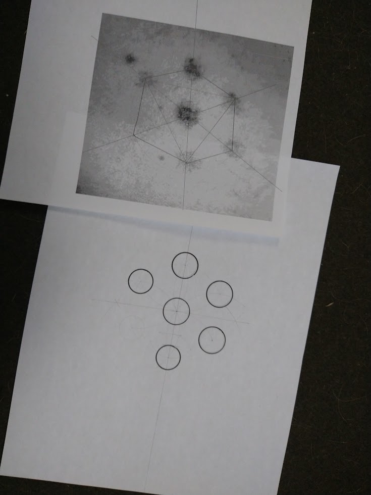 The RGMP is composted of six dots within a “seed of life” pattern, which is composed of intersecting circles of the same diameter. The size of the dots are proportional with size of the grid. The dots exhibit the typical static-light (like a red laser) burn appearance. The intensity of the dots appear to vary according to a regular diffusion pattern. Using the metaphor of light through a grid stencil, the missing dot, as well as the sharp definition of the seed of life figure, suggests the part of the grid was covered up with something opaque.